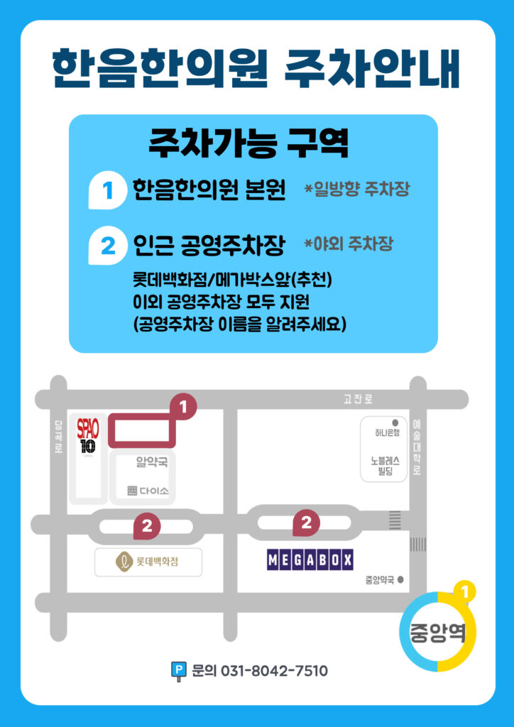 혹은 안산 한음한의원 을 입력하시면 지하 1, 2층에 주차장이 있습니다.