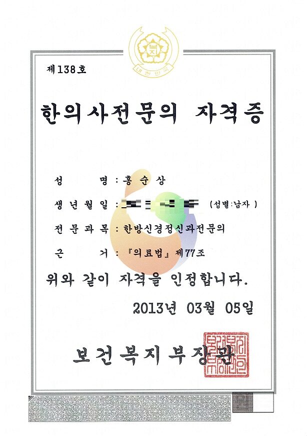목동점 홍순상 원장 한방신경정신과 전문의 자격증